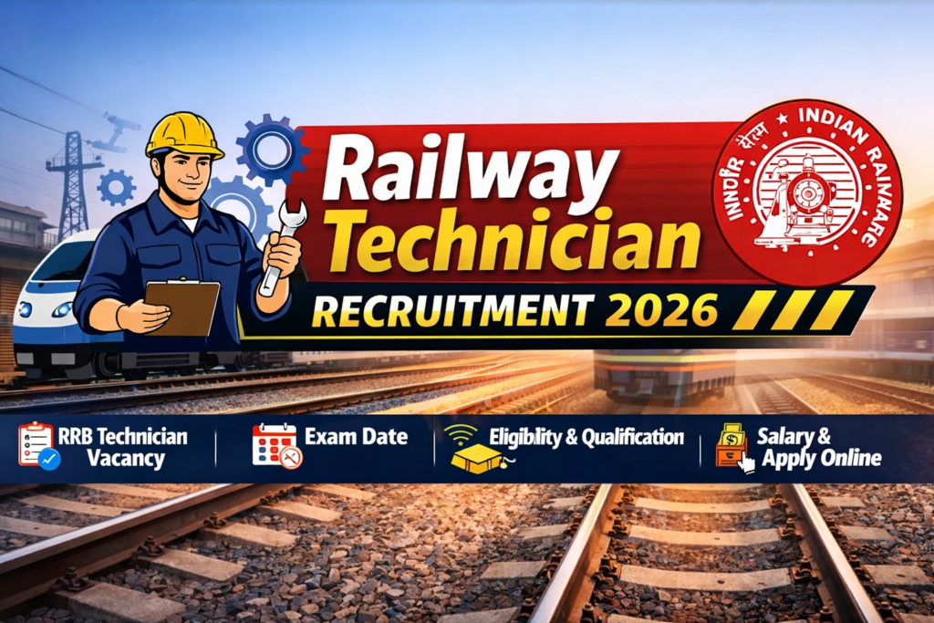अगर आप रेलवे में तकनीकी पद पर नौकरी करना चाहते हैं, तो Railway Technician Recruitment 2026 आपके लिए एक अच्छा अवसर हो सकता है। हर साल रेलवे भर्ती बोर्ड अलग-अलग तकनीकी पदों के लिए भर्ती जारी करता है। इस बार भी Railway Technician Recruitment 2026 के तहत कई पदों पर आवेदन की संभावना है। बहुत से उम्मीदवार Railway technician apply online 2026 से जुड़ी जानकारी खोज रहे हैं। जो उम्मीदवार रेलवे टेक्नीशियन भर्ती 2026 या आरआरबी टेक्नीशियन भर्ती 2026 की तैयारी कर रहे हैं, उनके लिए यह भर्ती रेलवे में तकनीकी क्षेत्र में करियर शुरू करने का मौका हो सकती है।